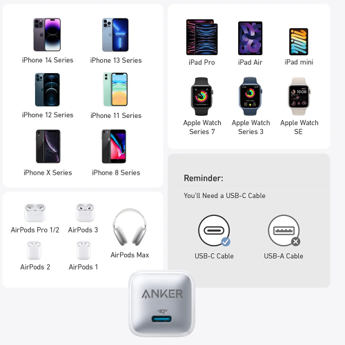 Сумісність iPhone 14 / 14 Pro / 14 Pro Max / 13 / 13 Mini / 13 Pro / 13 Pro Max / 12 / 12 mini / 12 Pro / 12 Pro Max / iPhone SE (2-го покоління) / 11 / 11 Pro / 11 Pro Max / XS / XS Max / XR / X / 8 Plus / 8; iPad 10,2 дюйма /; iPad mini 8. 3-дюймовий/; iPad Pro 12,9-дюймовий 4-го / 3-го / 2-го / 1-го покоління; iPad Pro 11-дюймовий 2-го / 1-го покоління; iPad Pro 10,5-дюймовий; iPad Air 4-го / 3-го покоління; iPad 8-го / 7-го покоління; iPad mini 5-го покоління, AirPods, Apple Watch