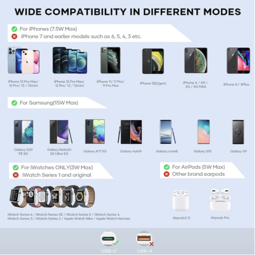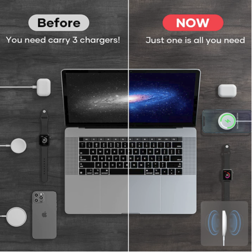 Модернизированная двусторонняя зарядка LICHEERS 3 в 1 Wireless Charger позволит заряжать телефон, часы или наушники. Зарядное устройство надежно прикрепляется к вашему гаджету, центрирует катушки параллельно друг другу. Максимальная выходная мощность зарядного устройства равняется 15 Вт, что позволяет заряжать аккумулятор гораздо быстрее. Благодаря небольшим размерам и ультратонкому корпусу зарядное устройство легко помещается в кармане и маленькой сумке, что значительно облегчает транспортировку. Таким образом, вы можете заряжать свой девайс не только дома, но и на работе или во время поездки.