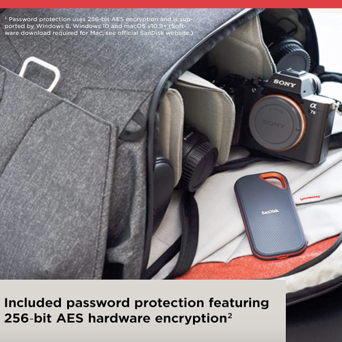 ОписSANDISK Extreme Portable – це зовнішній накопичувач з компактним корпусом і високою стійкістю до зовнішніх факторів , таких як вода, пил та удари. Швидкість передачі даних зі швидкістю читання до 2000 МБ/с забезпечує ефективне та комфортне збереження фотографій і відео. Ємність жорсткого диска ємністю 4000 ГБ дозволяє зберігати кілька файлів. З іншого боку, велика кількість роз'ємів і сумісність з системами Windows і Mac дозволяють універсально використовувати пристрій. Крім того, накопичувач виглядає чудово завдяки сучасній лінійці та чорному корпусу з помаранчевими акцентами.