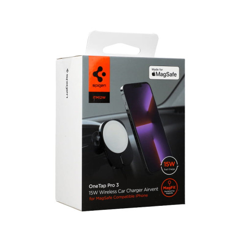 ITM12W OneTap Pro 3 - практичний гаджет для власників смартфонів з технологією MagSafe. Цей інноваційний автомобільний тримач від Spigen поєднує в собі функції зарядки та підставки. Він оснащений оригінальним модулем Made for MagSafe від Apple. Вбудовані магніти стабільно утримуватимуть ваш телефон в одному місці, і ви зможете вільно користуватися смартфоном, не турбуючись про те, що він впаде або переміститься.