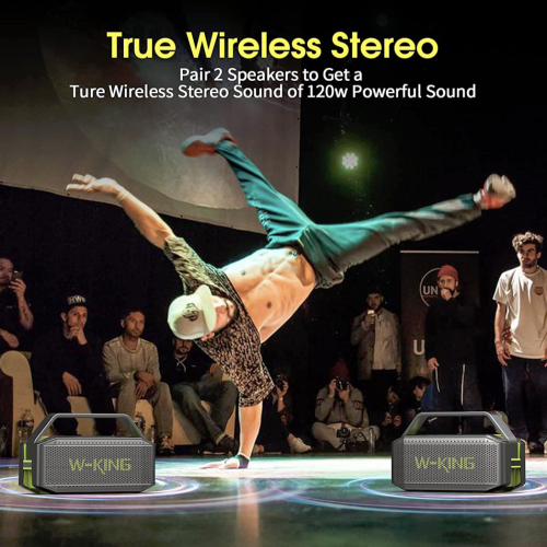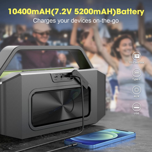 Колонка, яка не тільки виглядає, але і звучить могутньо. Робота до 40 годин від батареї, захист від води за стандартами IPX6, посилений корпус, регульована ручка для комфортного використання — роблять її відмінним компаньйоном для активного відпочинку та пригод по міських джунглях. Якісне звучання 2х динаміків з загальною потужністю 120 Вт, забезпечать насичений, глибокий звук з чудовими басами. Акумулятор на 12000 мА*ч надасть можливість слухати улюблені треки, не замислюючись про підзарядки до 40 годин в режимі non-stop. Завдяки спеціальній конструкції колонка захищена від бризок, дощу, пилу і піску, а тому ідеально підходить для відпочинку на пляжі і у басейну. Гаджет не тільки виглядає потужно, але і забезпечений додатковими ребрами жорсткості, а значить просто-таки створений для бездоріжжя, гір, кемпінгу і прогулянок. Ви можете прослуховувати музику через Bluetooth (до 10 м), USB порт через флешку або підключивши колонку з допомогою 3.5 мм аудіо-кабелю (AUX). Вбудований мікрофон з системою шумозаглушення, що гарантує високу якість передачі голосу без зайвих перешкод. Відповідайте на телефонні дзвінки одним натисненням кнопки. Також від колонки можна з легкістю заряджати всі ваші гаджети. Повністю сумісна з усіма пристроями з підтримкою Bluetooth.